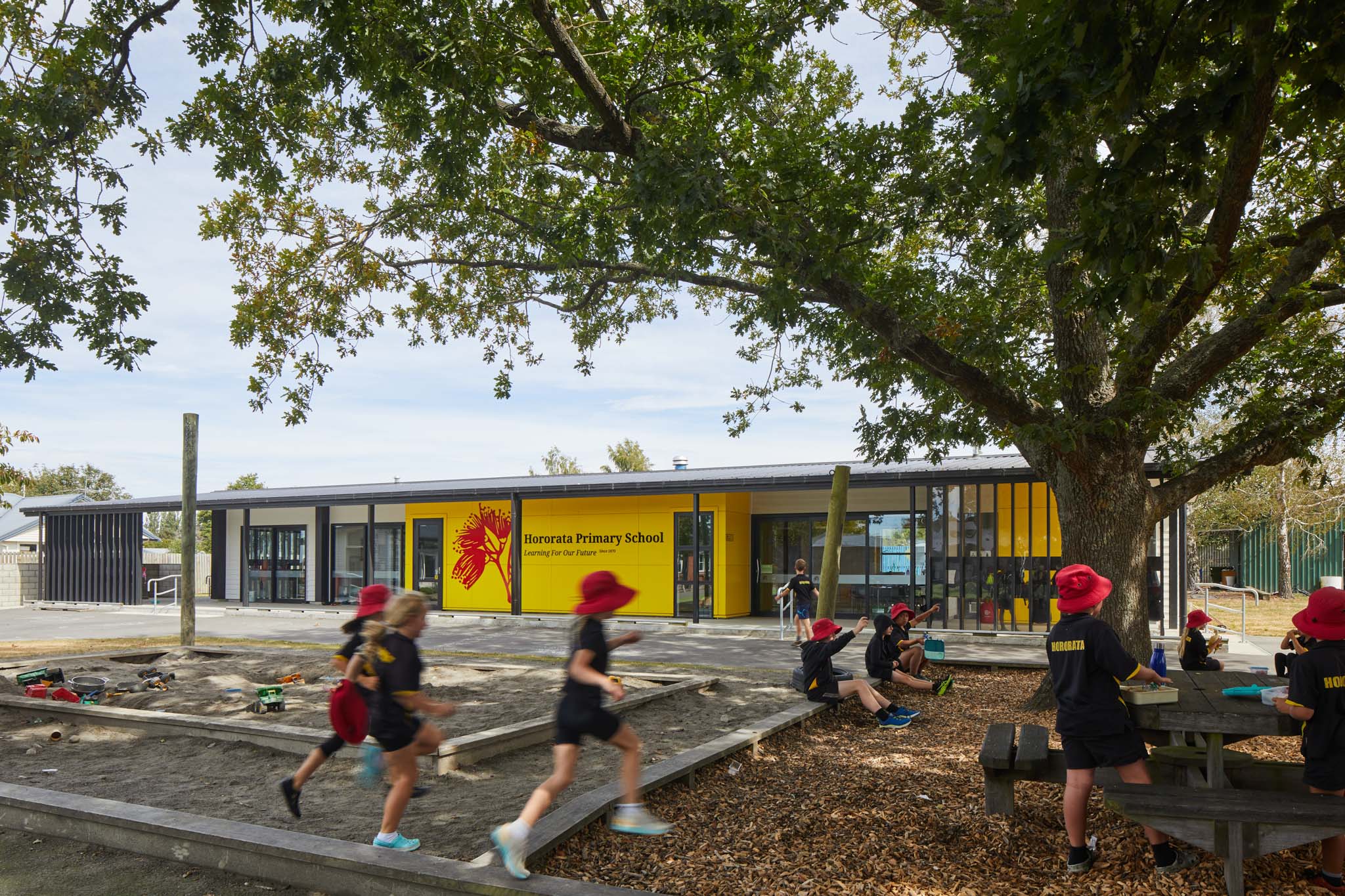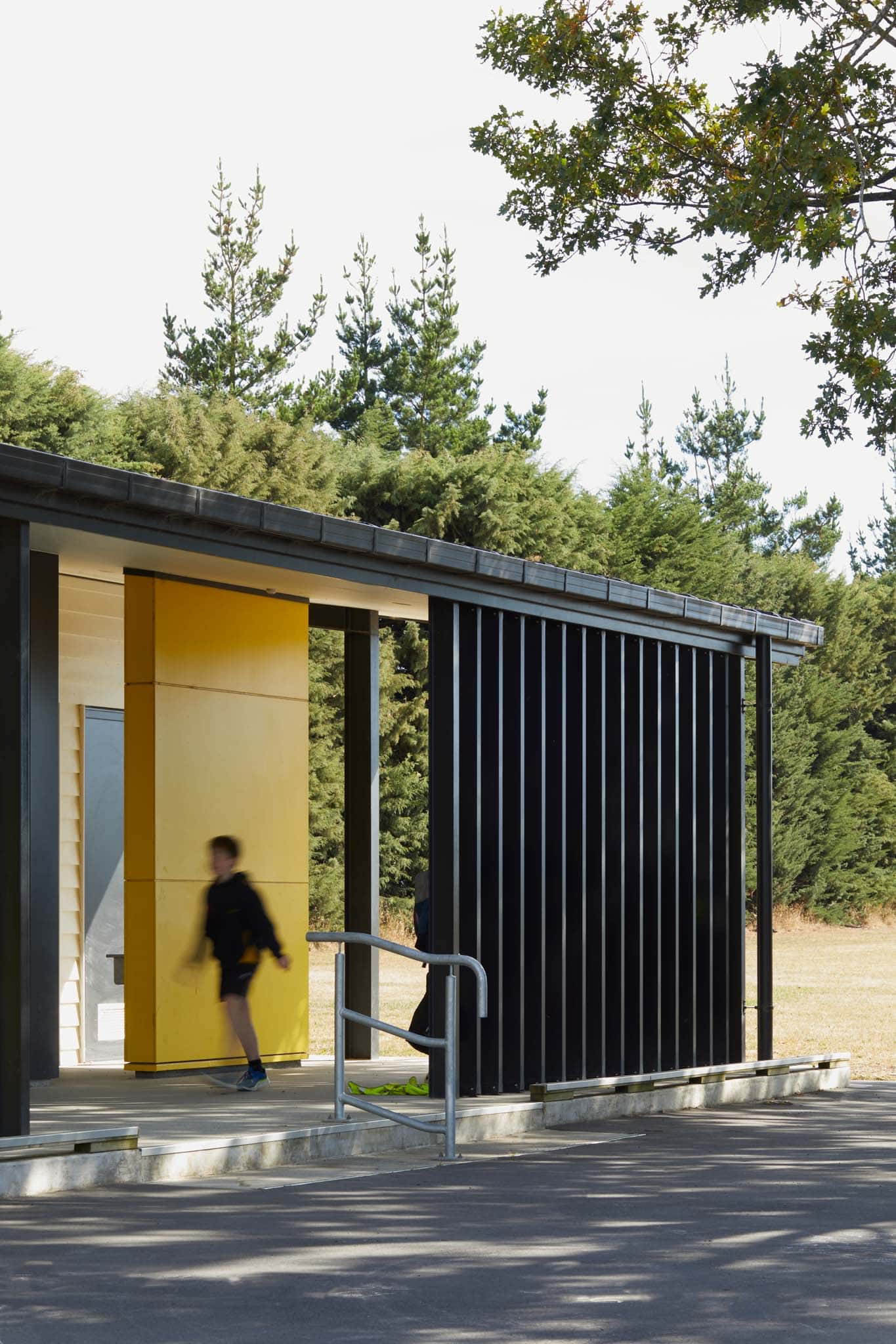 This new classroom block was designed to accommodate two classrooms, breakout spaces, teacher meeting room and external toilets for the use of the student within the classroom block and on the playing fields. The structure allows for flexible open plan spaces. The classroom spaces open onto a large covered area which leads to the outdoor learning spaces. The outdoor areas are screened with vertical louvers to provide shelter but also a visual connection to the school grounds beyond.